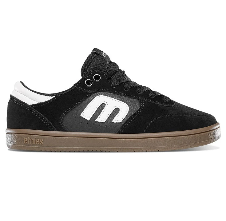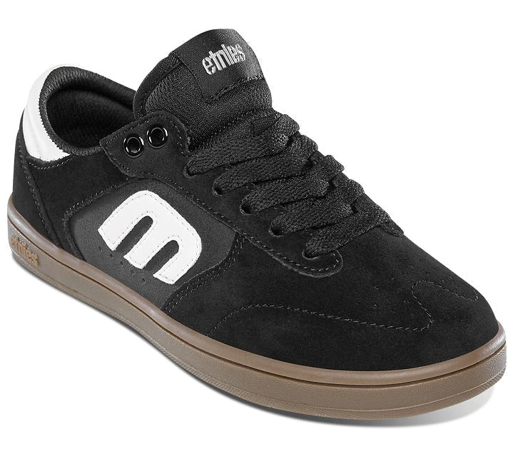 Pair of Etnies Windrow Kids Skate Shoes in Black, Gum and White.